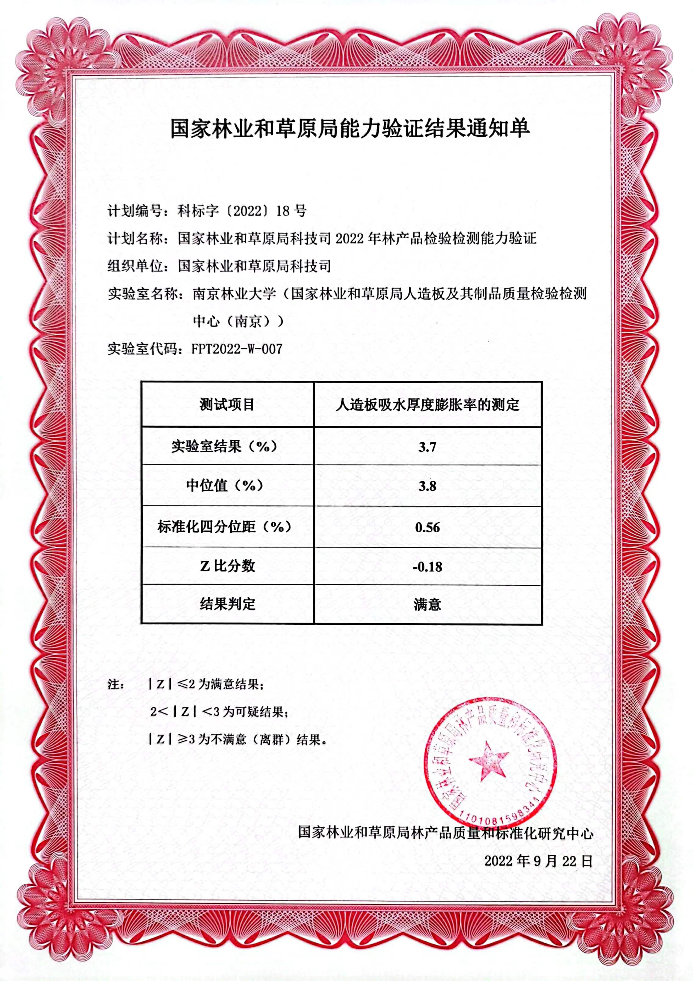 近日,国家林业和草原局科技司下发了“关于2022年林产品检验检测能力验证结果的通告”科标字〔2022〕60号,2022年林产品检验检测能力验证活动参加机构共117家,中心参加了木质林产品质量指标的全套4项(人造板干燥器法甲醛释放量的测定、人造板穿孔法甲醛含量的测定、人造板静曲强度的测定、人造板吸水厚度膨胀率的测定),4项指标验证结果均为满意,并有2项的验证结果Z比结果为0的优秀成绩。